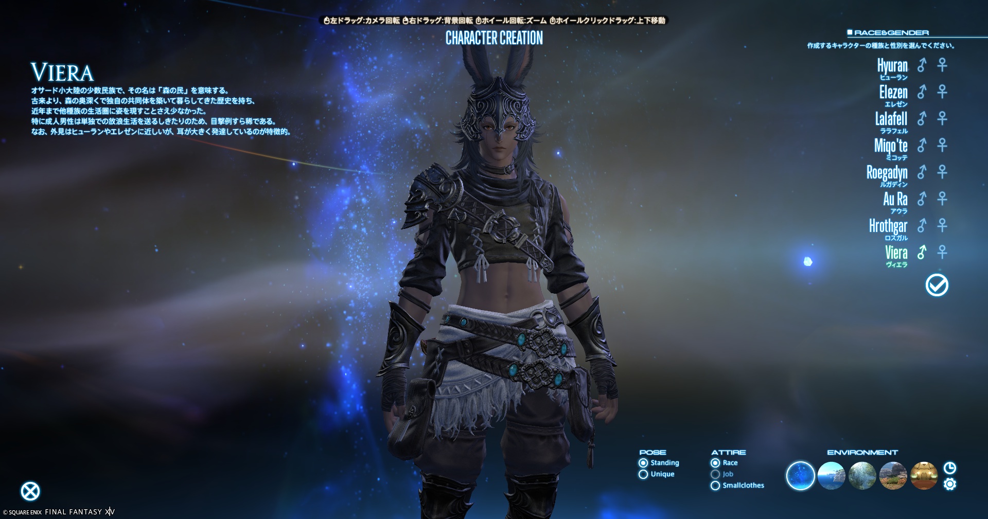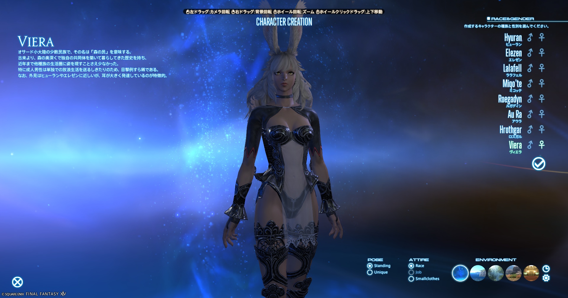 ヴィエラは、ウサギのような耳とスリムな体型が特徴的な種族で、優雅さと野性的な魅力を併せ持つ種族です。スタイリッシュで洗練されたデザインが人気です。